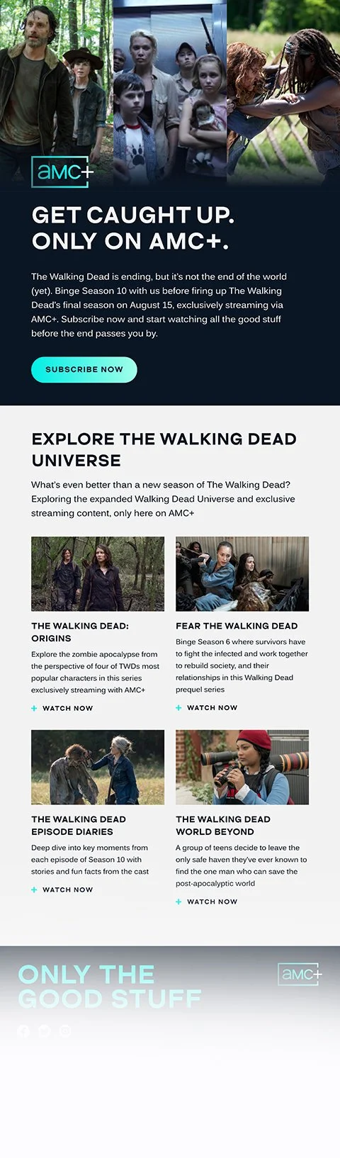 I have worked with the team at Ready Set Rocket on a few projects. This latest project was an email campaign for AMC+ network to generate excitement for the next season’s movie and series offerings. As one of the network’s most popular shows, The Walking Dead took prominence in the content. The tone was crafted to align with the brand’s tagline - ONLY THE BEST, and was intentionally exciting with a strong infusion of “Be the first…”